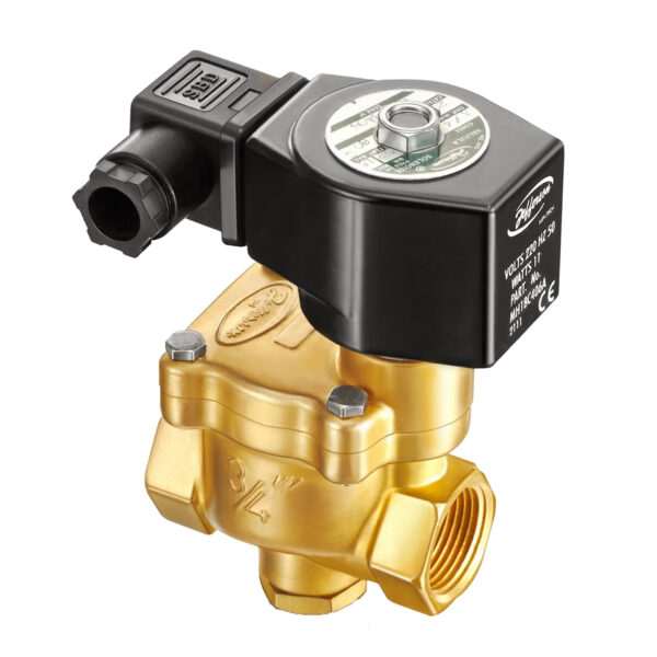 Servo operada. Conexiones roscadas de 3/4” a 3 ” BSP o NPT. Cuerpo de latón forjado o acero inoxidable. Tubo de deslizamiento de AISI 304. Núcleo móvil y núcleo fijo de AISI 430FR. Espira de sombra de cobre, plata o aluminio. Bobinas capsuladas conexión ISO 4400 / EN 175301-803 (Ex DIN 43650) forma A. Protección IP65 y NEMA 4x.